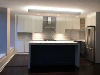 Clean, contemporary kitchen and luxury living renovation featuring crisp white cabinetry, a contrasting dark island, and integrated stainless steel appliances, featuring open layouts that enhances flow and brightness throughout the space.