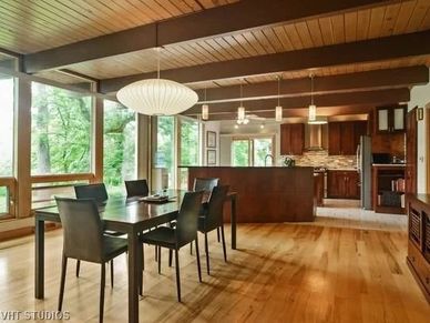 Warm, modern kitchen with natural wood finishes, exposed ceiling beams, and an open dining connection. The design emphasizes clean lines, generous natural light, and a seamless indoor-outdoor feel, creating a functional yet inviting space centered around craftsmanship and simplicity.