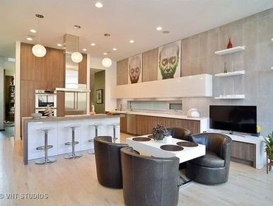 Modern Italian-inspired kitchen featuring sleek wood cabinetry, minimalist detailing, and an open-concept layout. The design integrates a large waterfall island with bar seating, contemporary lighting, and a cohesive living - dining area, creating a refined yet functional space ideal for urban living.